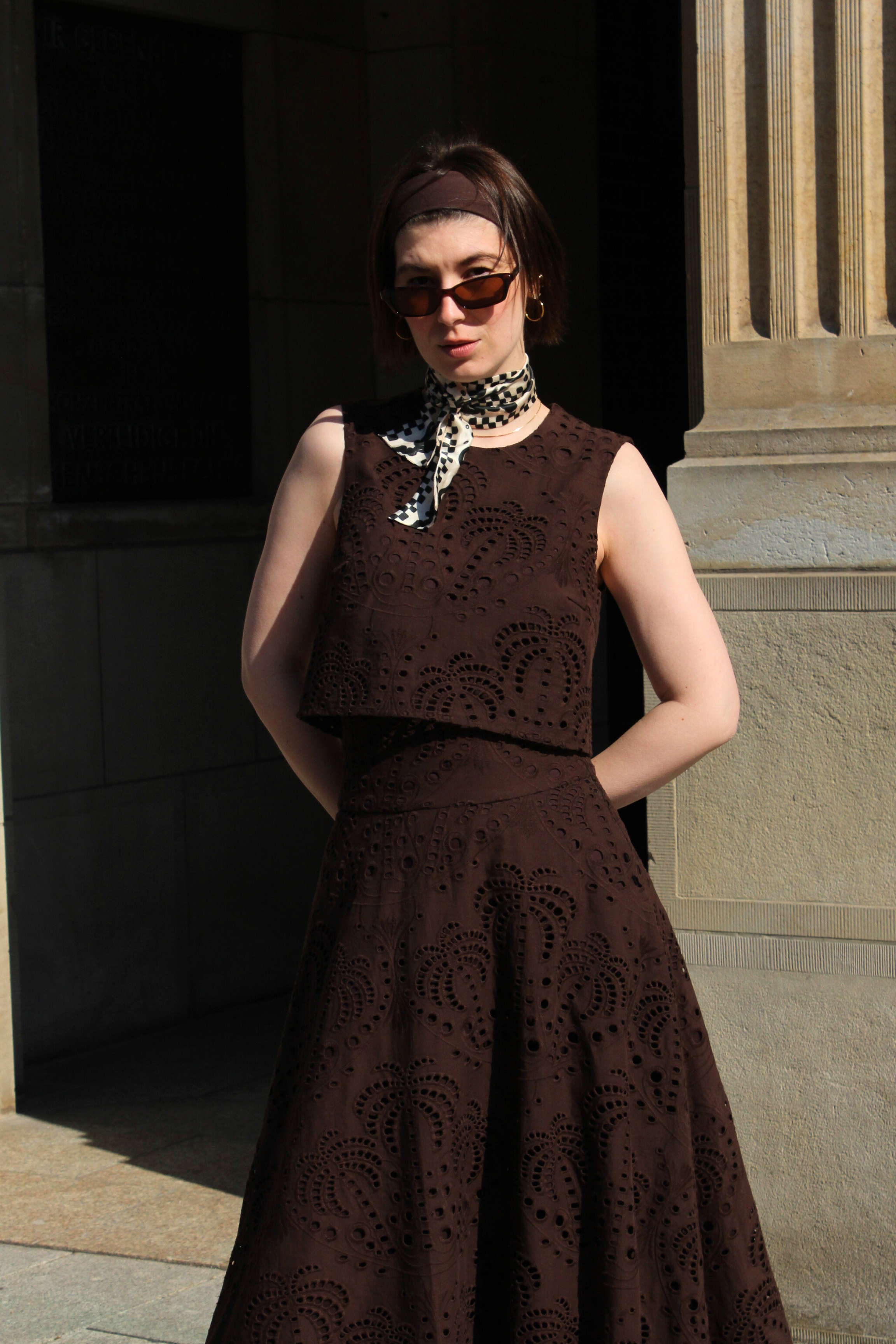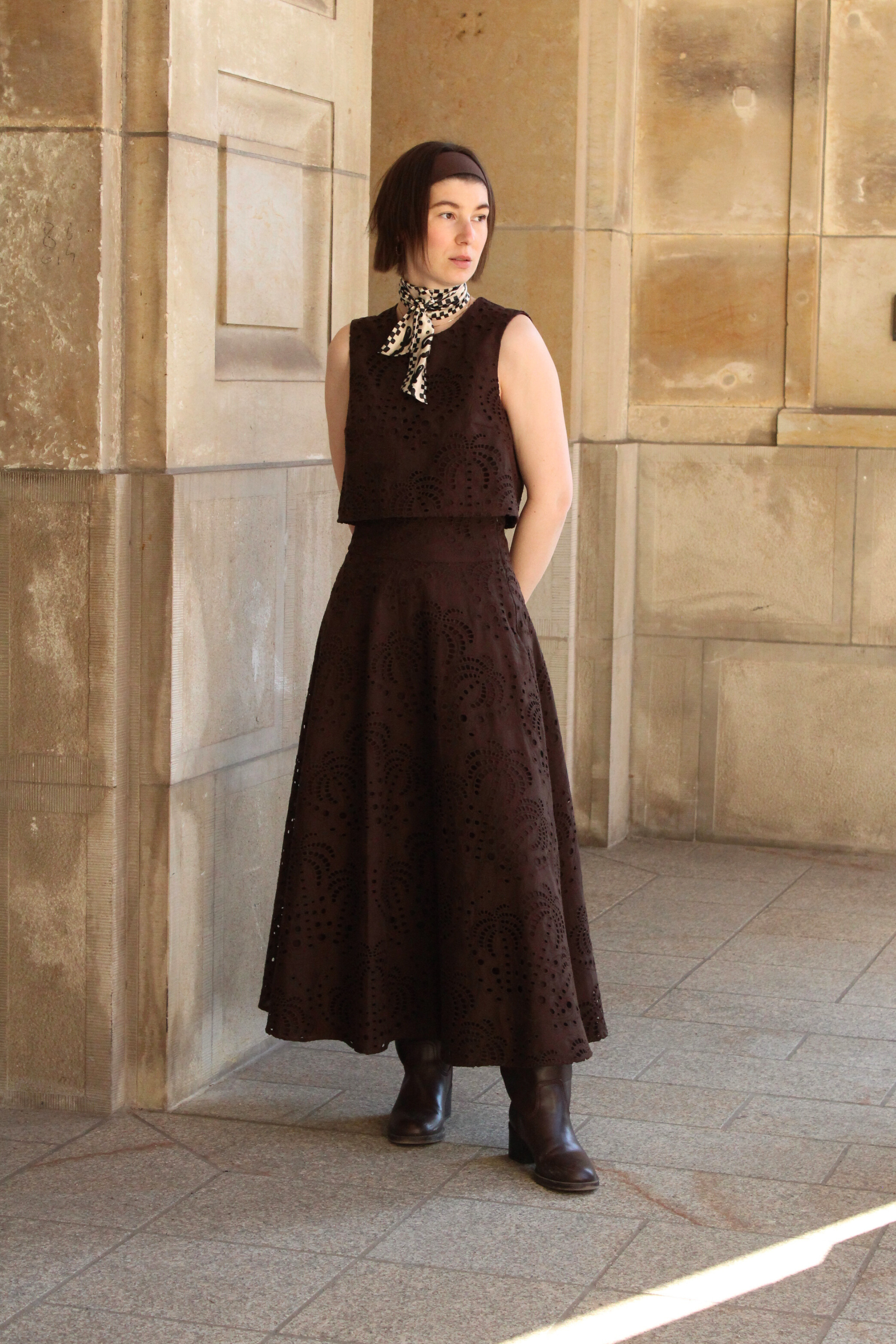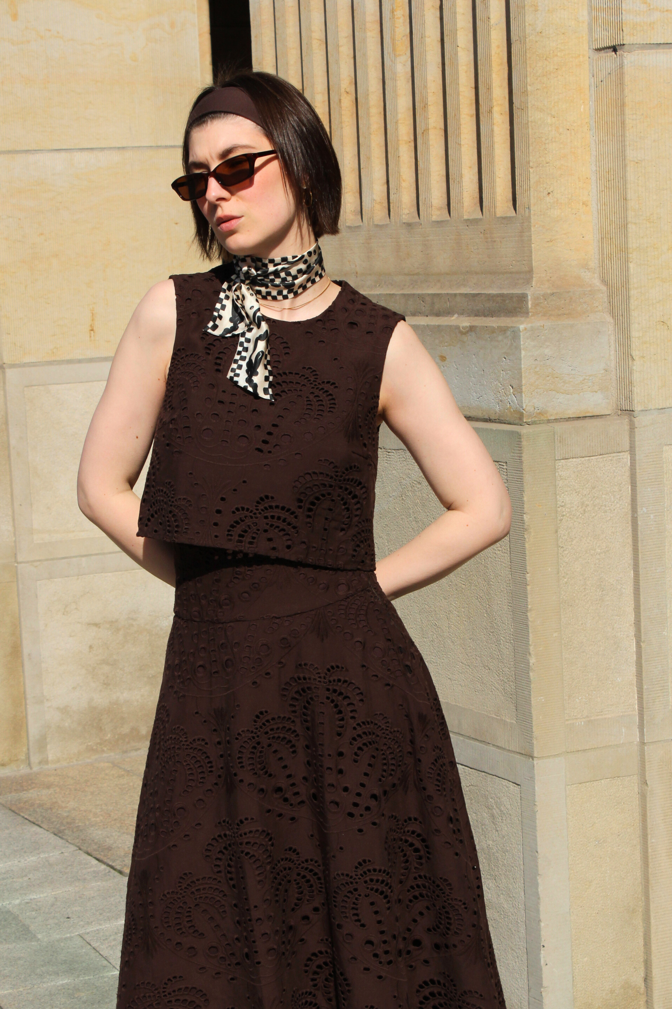 Das Croptop „Brown Embroidery“ aus der Sommerkollektion 2026 vereint eine klare, moderne Silhouette mit feinen handwerklichen Details. Der warme Braunton wirkt zeitlos und hochwertig, während die zarte Lochstickerei dem Look eine feminine Leichtigkeit und eine edle Struktur verleiht.